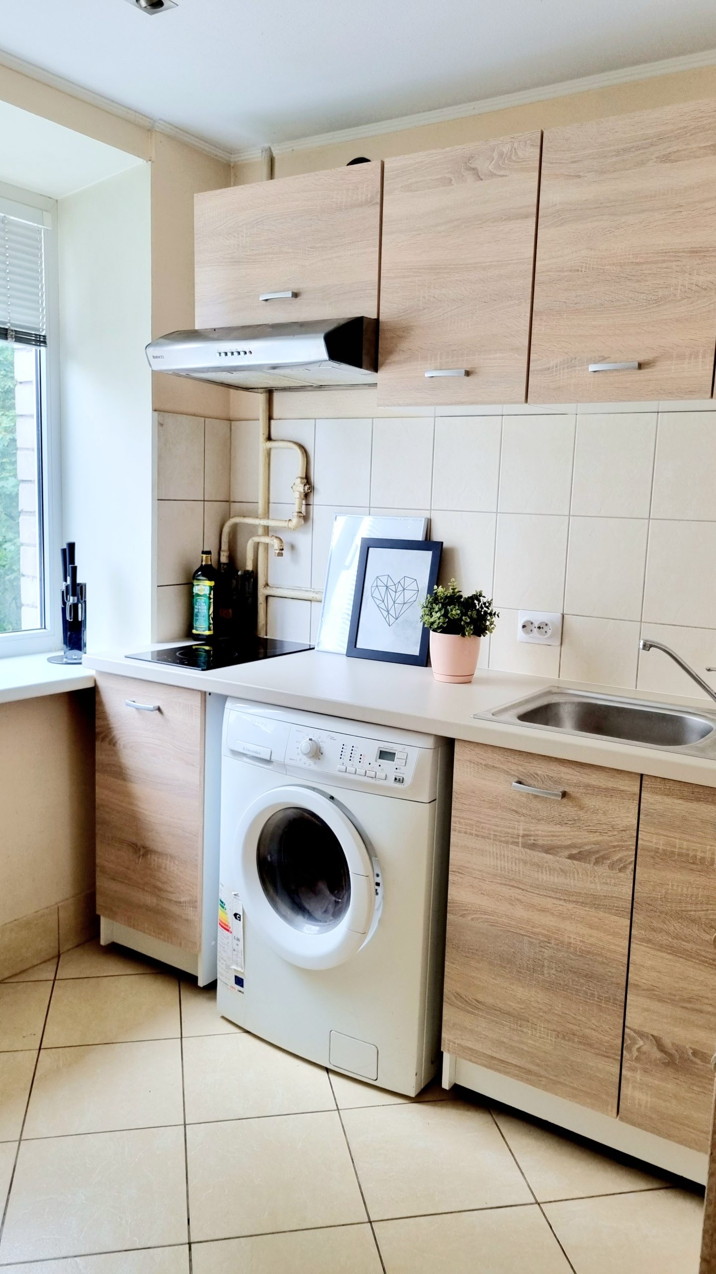 Very low utility bills: €50 in summer, €110 in winter. This bright and quiet apartment overlooks a green courtyard. Sunny, dry, and warm. Furnished, with appliances, meters, a closed and clean entrance, and a coded key. Nearby are a market, Rimi, Lidl, public transportation stops, schools, and kindergartens